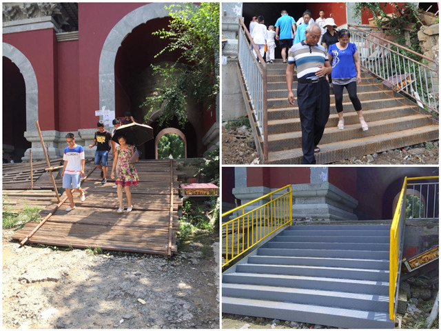 “洞子口”是武當(dāng)老百姓對(duì)玉虛宮鐵路涵洞的俗稱,這也是玉虛宮與武當(dāng)山步行街連接的唯一人行通道。2013年至今,經(jīng)過3年多漫長(zhǎng)施工,玉虛宮鐵路涵洞仿古建工程基本竣工,但唯獨(dú)步行街一側(cè)行人臺(tái)階遲遲未建,一直使用臨時(shí)竹排代替石梯供行人通行,給居住在玉虛宮涵洞以南居民以及游客出行帶來極大不便,特別給老人、孩童出行造成更大困難,時(shí)常有路人在此摔倒受傷。