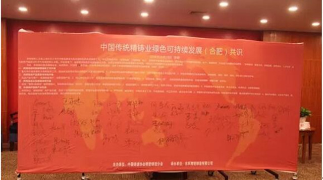 在東風(fēng)精鑄、精鑄分會(huì)組織倡議下,10月28日,傳統(tǒng)精鑄第五屆高層論壇順利舉行,來自國內(nèi)重點(diǎn)精鑄企業(yè)、科研院所、社團(tuán)等 95名代表,在安徽合肥共同見識(shí)了《中國傳統(tǒng)精鑄業(yè)綠色可持續(xù)發(fā)展合肥共識(shí)》簽字儀式,其中60余名代表在幕板上簽字表達(dá)了綠色可持續(xù)發(fā)展的決心。